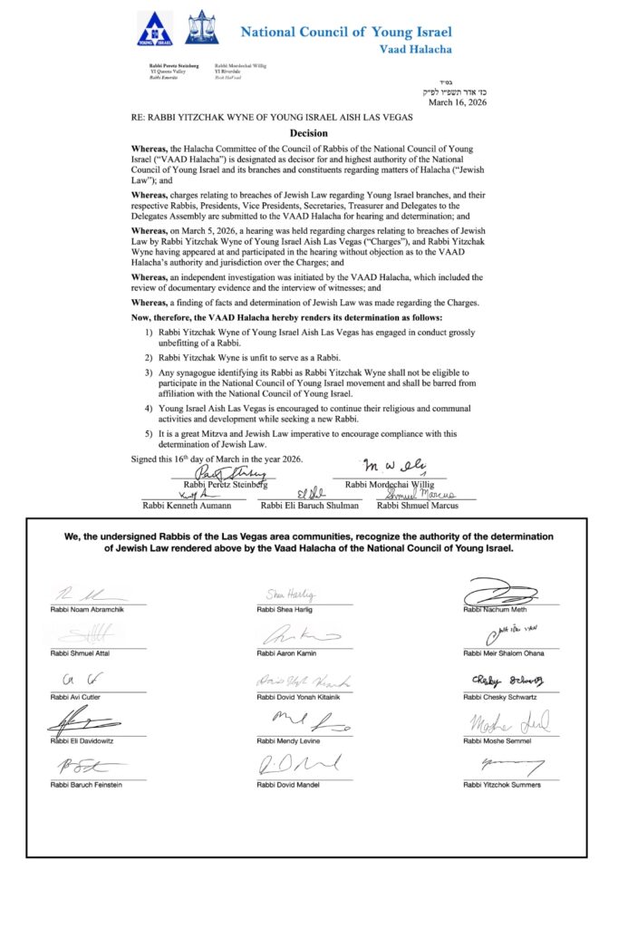 Unfortunately, the Young Israel council & all the Las Vegas rabbis have found the Young Israel Aish rabbi Yitzchak (Yitz) Wyne unfit to continue in his role. As a result, the Young Israel synagogue has changed its name and is now operating under a different name, “Torah Learning Center” (but the rabbi still manages the synagogue).